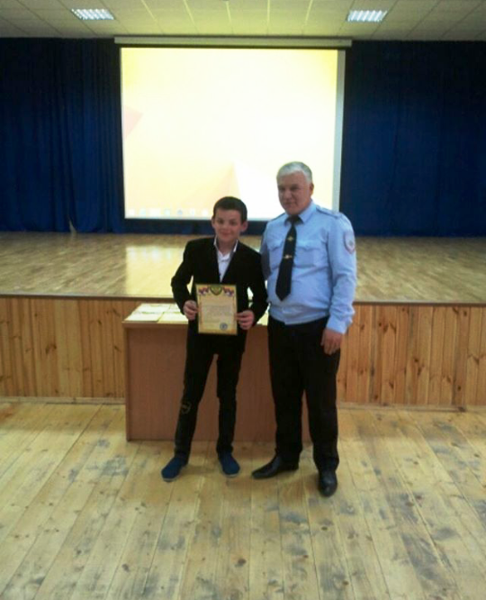 Командир отряда "Юный друг полиции" Идрисов Сайд-Эмин принимает Грамоту от заместителя руоковдителя МВД по ЧР за хорошу работу.