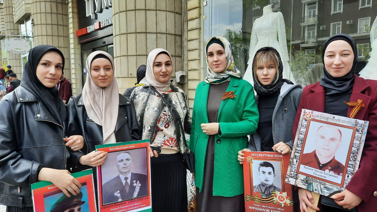 Работники МБОУ "СОШ 5 с. Ачхой-Мартан" во главе с директором Амриевой М.Х. приняли участие в параде "День Победы".