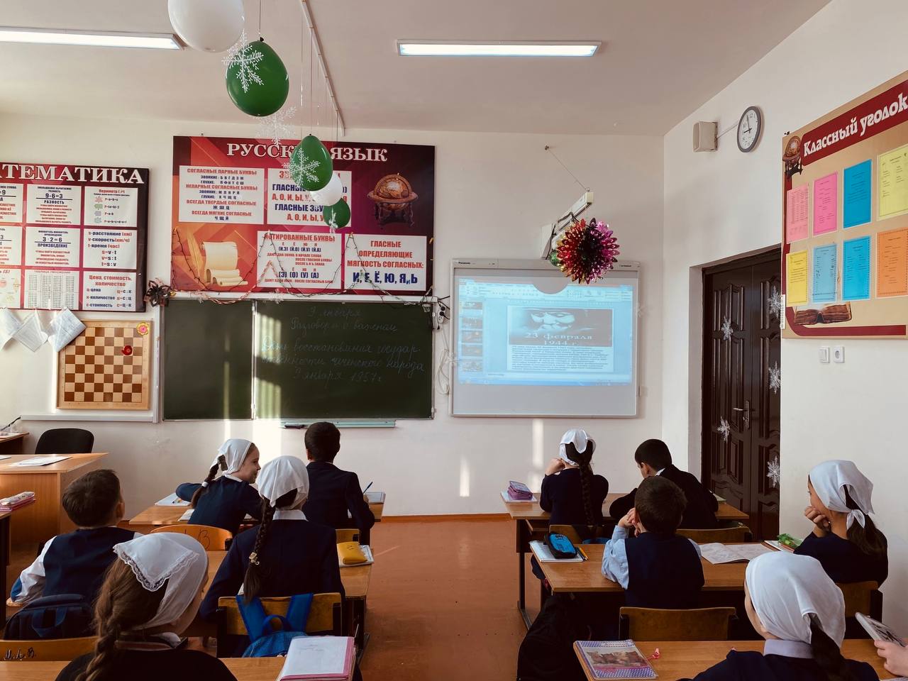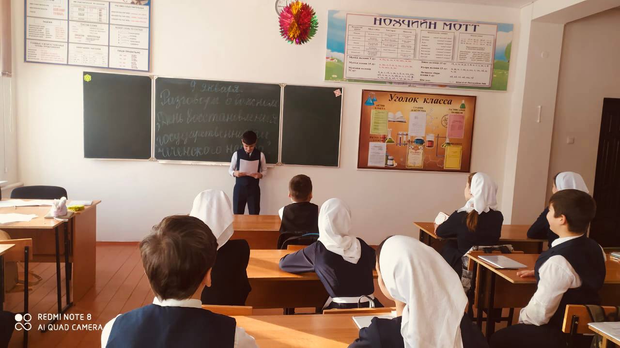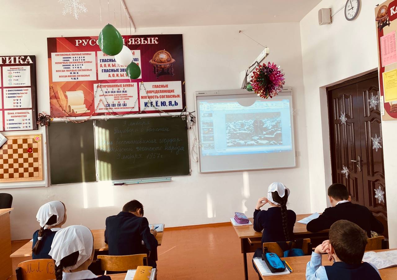 09.01.2023Уроки в начале 3 четверти начались с классного часа «Разговоры о Важном» на тему «День Восстановления государственности чеченского народа».