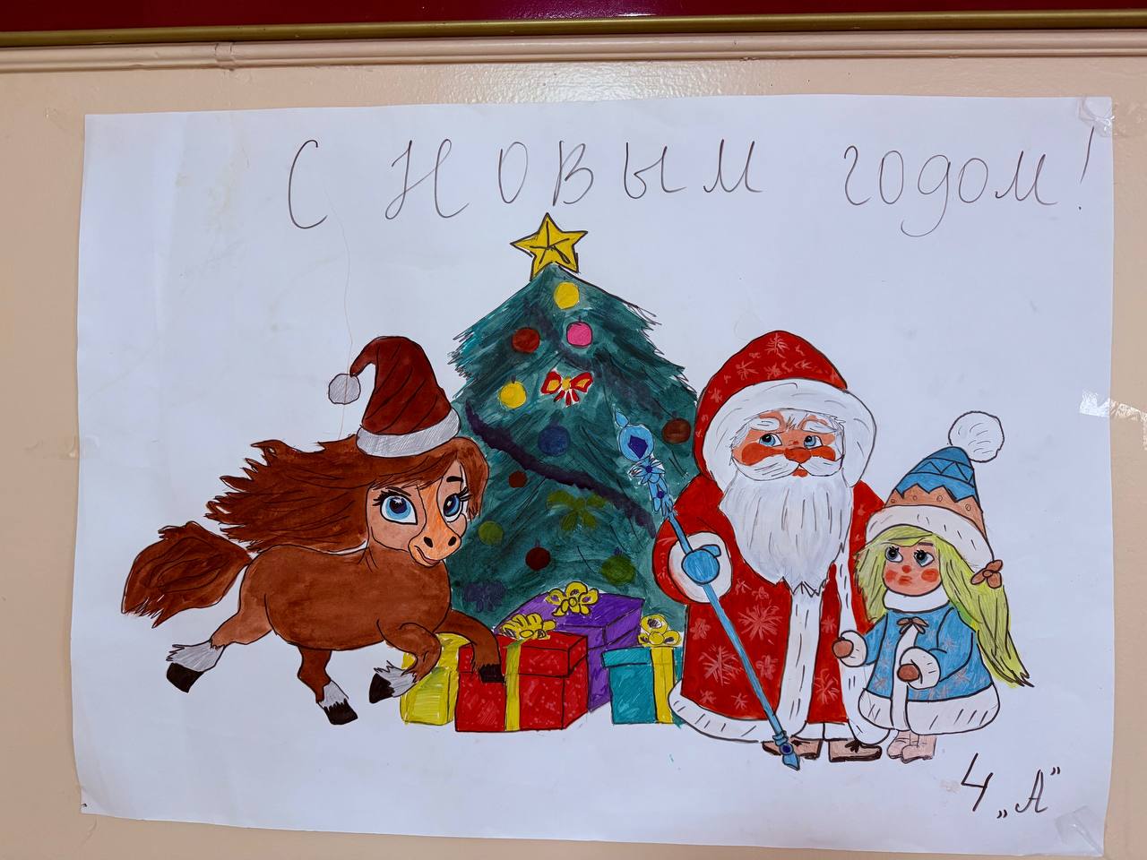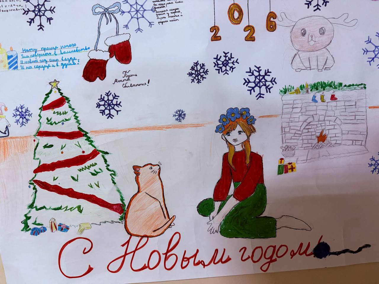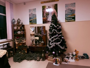 В фойе нашей школы расцвёл настоящий новогодний мир: мигающие гирлянды, пушистая ёлка с украшениями, красочные плакаты от ребят, а рядом — уголок "Старинного музея".
