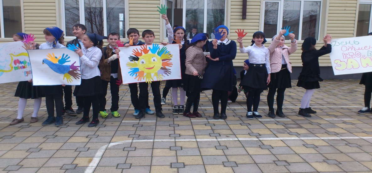 Завершая цикл мероприятий , посвященных Дню отмены КТО в нашей республике, во всех классах прошел Урок Мира « Мир в наших руках» После Уроков Мира самые активные участники мероприятий вышли на трассу вдоль нашей школы со своими плакатами и этим выразили свой протест против зла, насилия, войн и кровопролитий , подтвердили, что они за мир и дружбу на всей планете Земля.